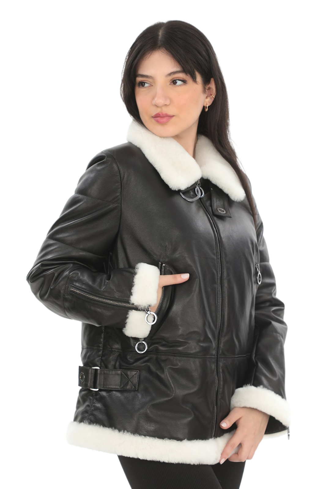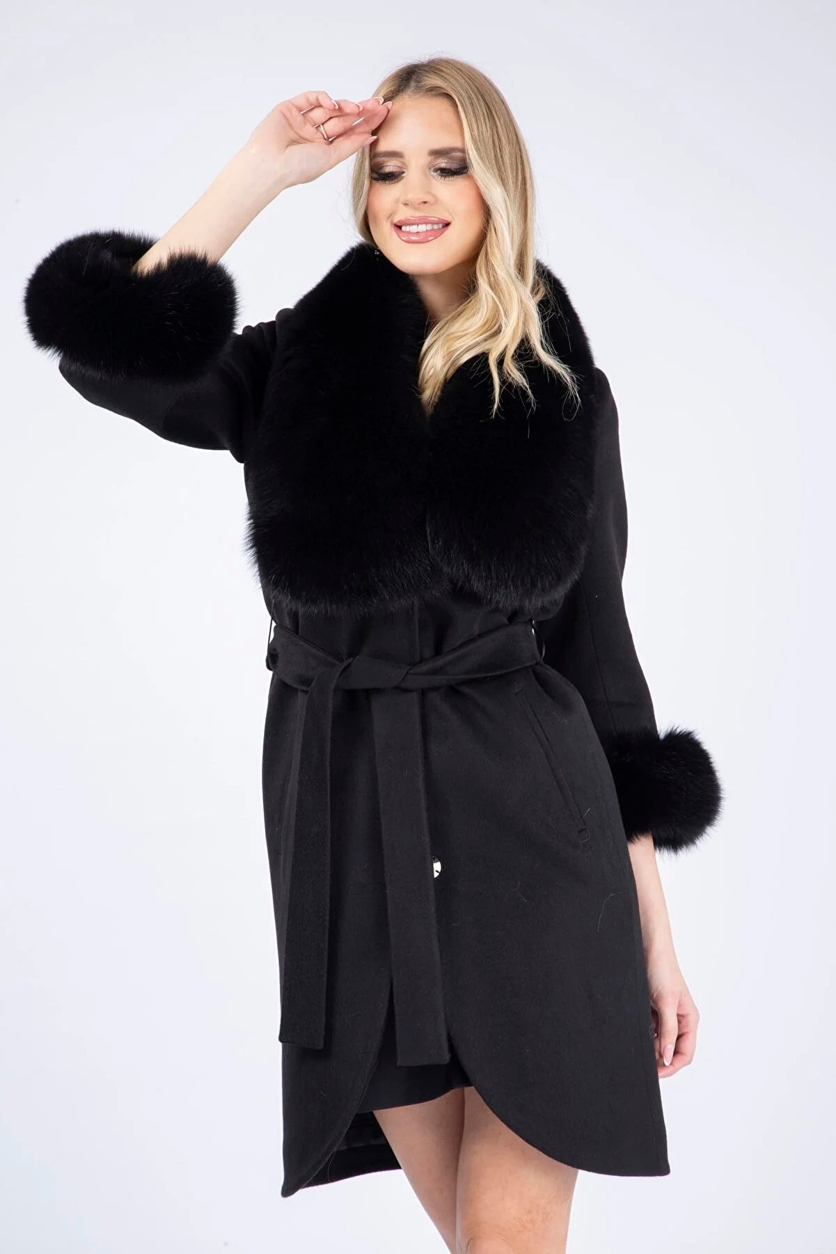 Kadın Tilki Aksesuarlı Hakiki Koyun Kürk Manto BDC122-OZEL6 (Dar Kalıp)