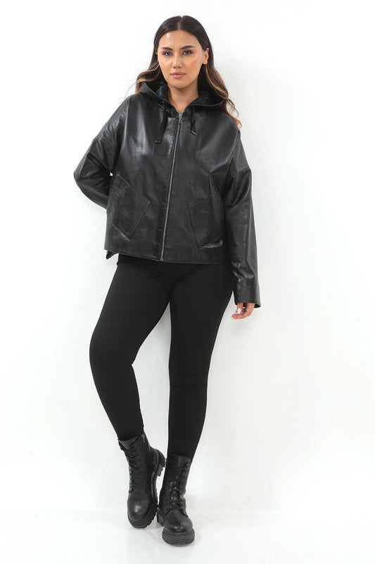 Kadın Hakiki Koyun Derisinden Kapüşonlu Deri Mont/Ceket BDC129 (Standart Kalıp)