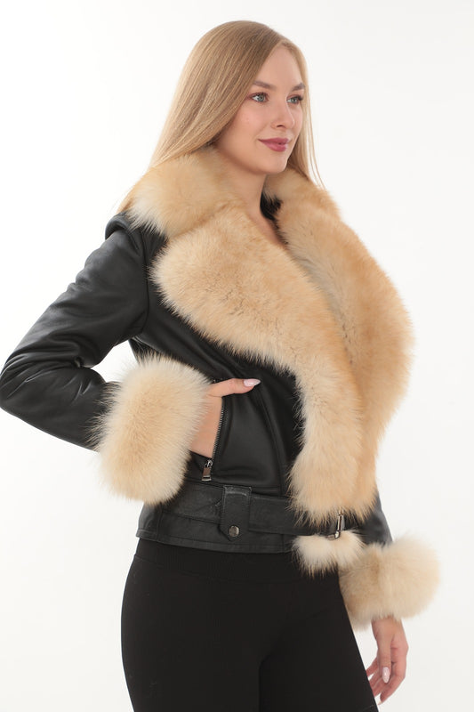 Women's Genuine Sheep Fur Coat with Fox Accessories BDC122-OZEL6 (Slim Fit)