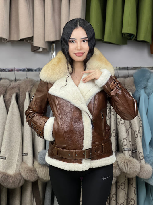 Brown Sheep Fur Coat with Genuine Fox Accessories OZEL1 (Standard Cut)