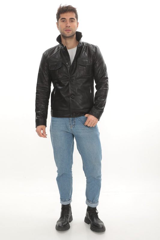 Men's Genuine Sheepskin Buttoned Leather Jacket/Coat EDC123 (Standard Fit)