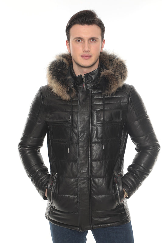 Men's Zig Genuine Sheepskin Hooded Leather Jacket/Coat EDC73 (Slim Fit)