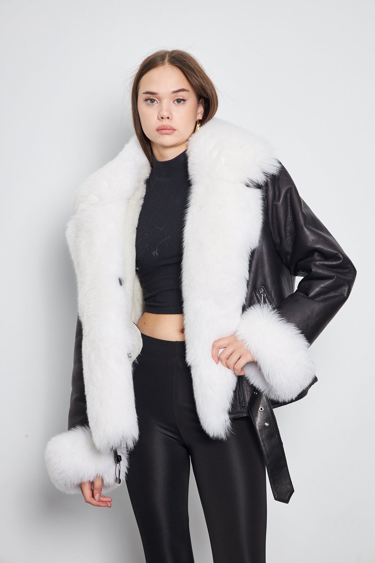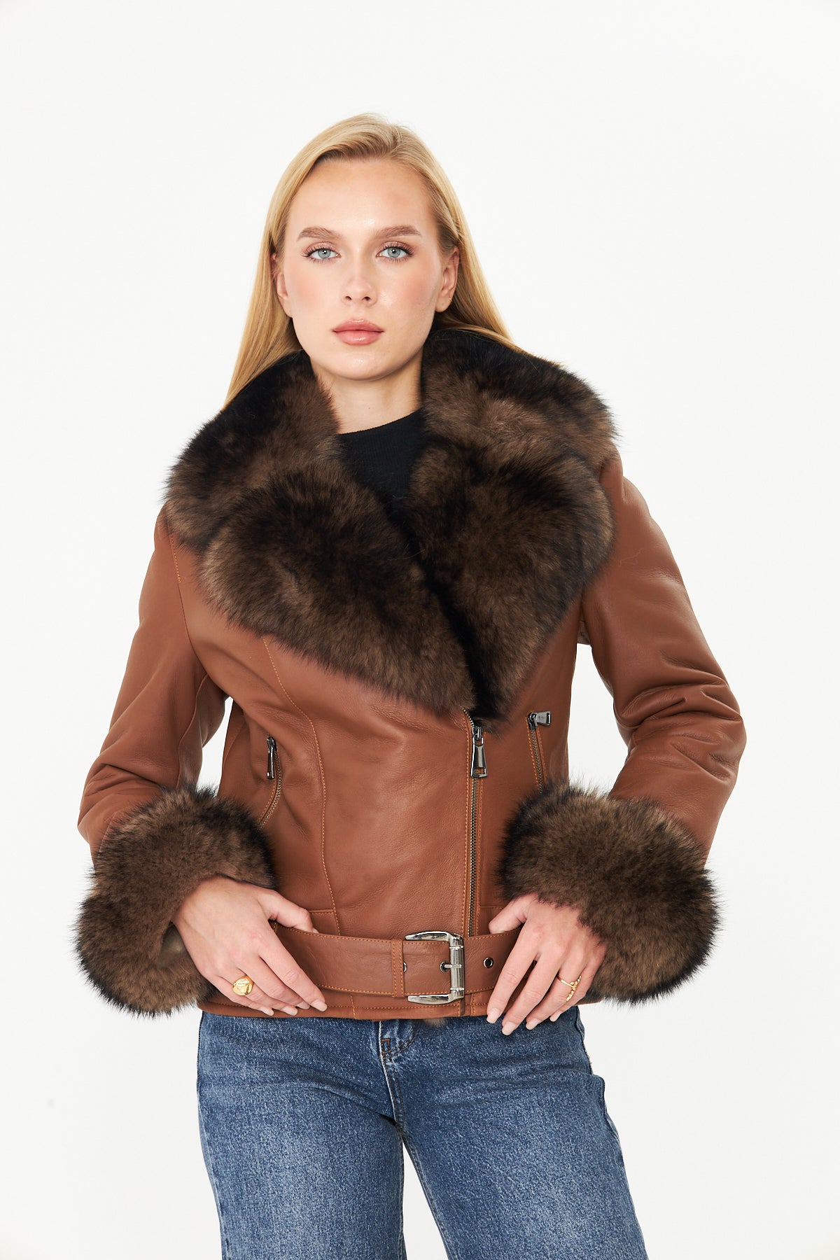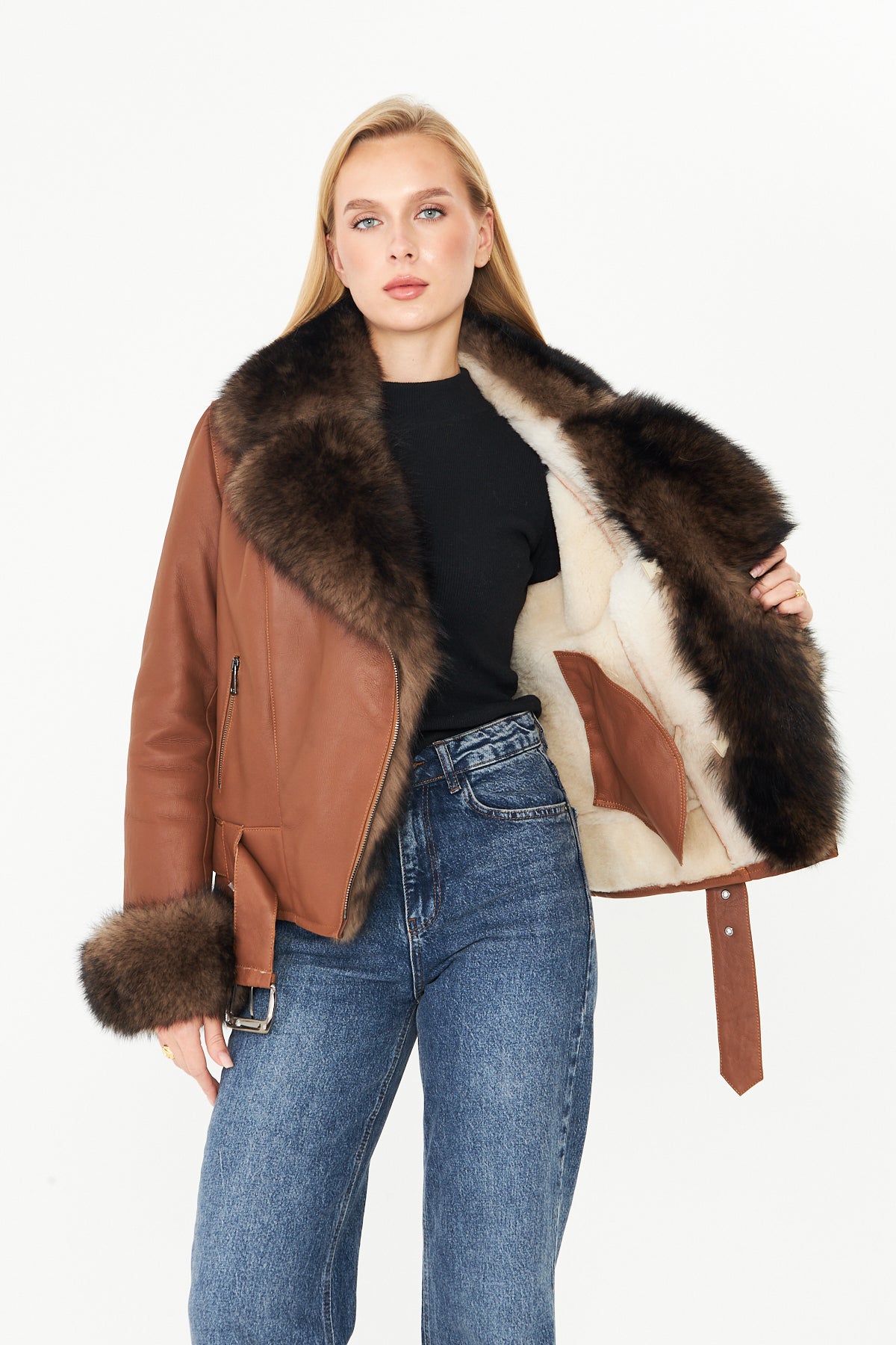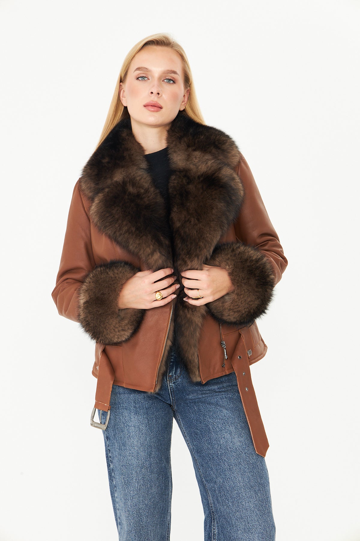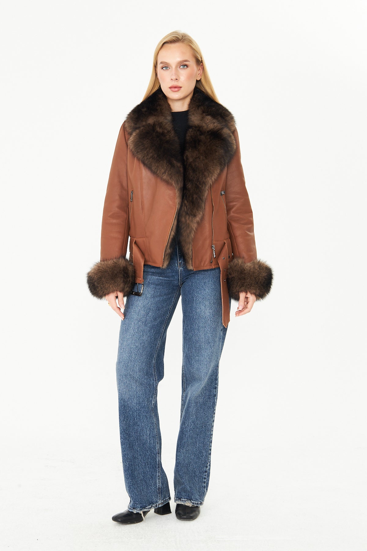 Kadın Tilki Aksesuarlı Hakiki Koyun Kürk Manto BDC122-OZEL6 (Dar Kalıp)